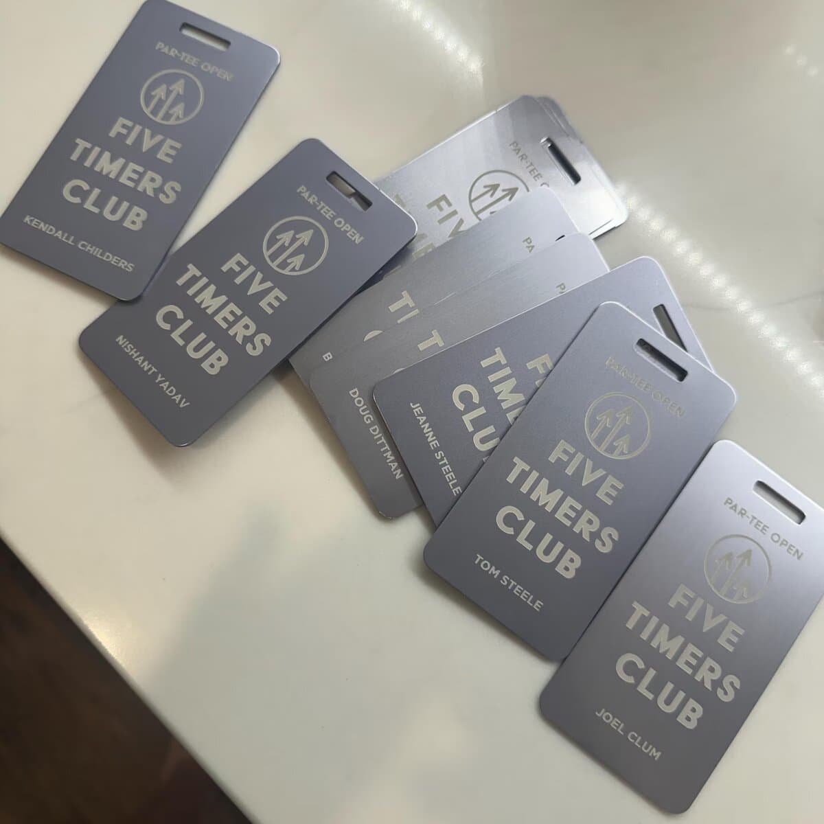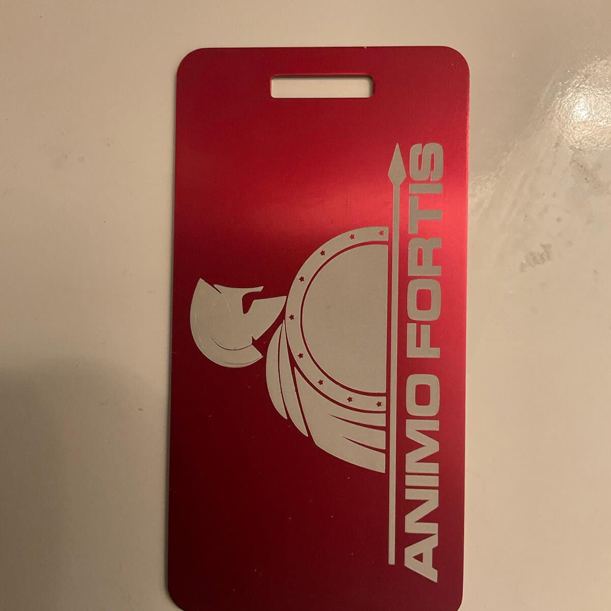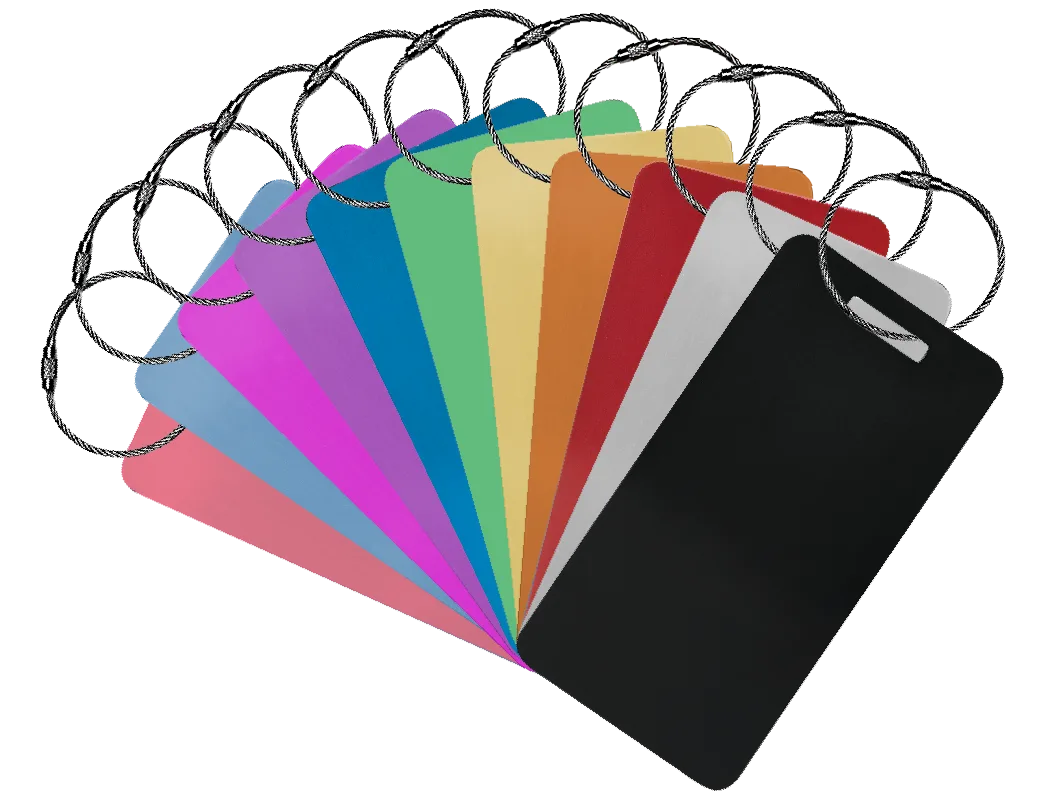 Permanent laser engraving on anodized aluminum. 12 colors, single or double-sided. Design live, approve your proof, and it ships engraved from Las Vegas. No minimum, bulk discounts available.